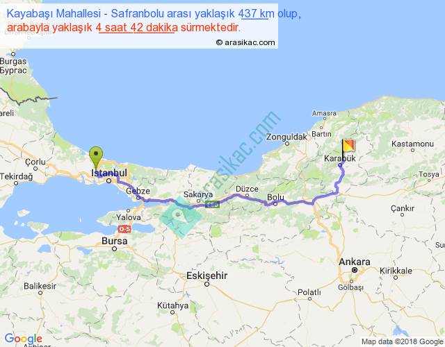 Kayabaşı Mahallesi - Safranbolu arası yaklaşık olarak 90 km/h ile yukarıda belirtilen sürede olup, iki yerin kuş uçuşu uzaklığı (mesafesi) 326'dir. Eğer belirtilen yerler arasında uçak seferi var ise bu süre uçakla 30 dakika'ya kadar düşebilir. Yolculuk otobüsle 6 saat 6 dakika sürmektedir.