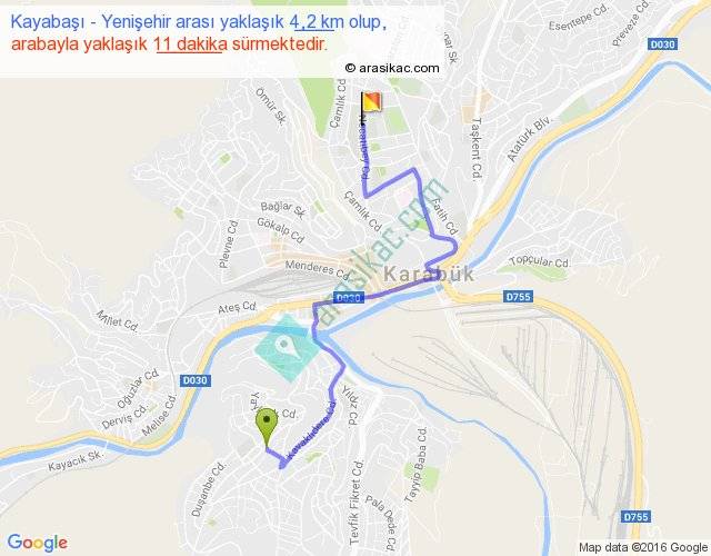Kayabaşı - Yenişehir arası yaklaşık olarak 90 km/h ile yukarıda belirtilen sürede olup, iki yerin kuş uçuşu uzaklığı (mesafesi) 2'dir. Yolculuk otobüsle 14 dakika sürmektedir.