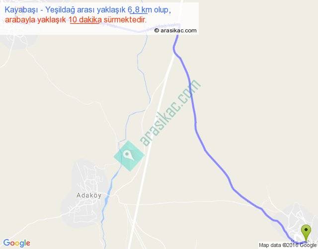 Kayabaşı - Yeşildağ arası yaklaşık olarak 90 km/h ile yukarıda belirtilen sürede olup, iki yerin kuş uçuşu uzaklığı (mesafesi) 6'dir. Yolculuk otobüsle 13 dakika sürmektedir.