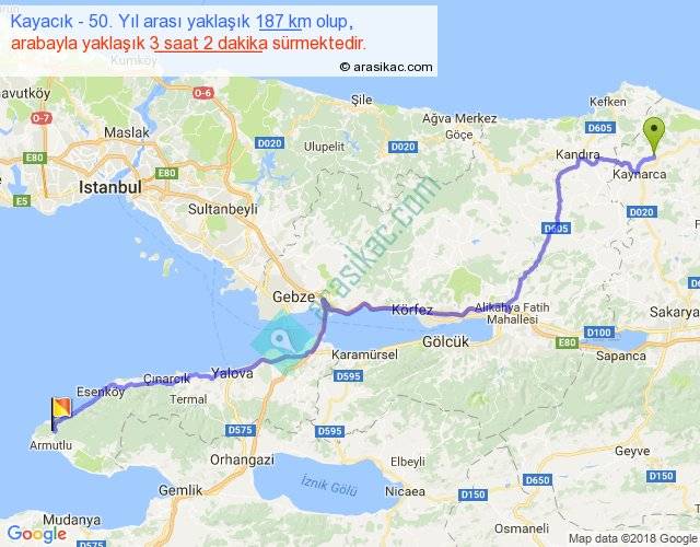 Kayacık - 50. Yıl arası yaklaşık olarak 90 km/h ile yukarıda belirtilen sürede olup, iki yerin kuş uçuşu uzaklığı (mesafesi) 139'dir. Yolculuk otobüsle 3 saat 56 dakika sürmektedir.
