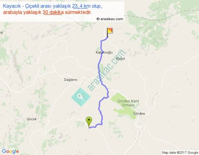 Kayacık - Çiçekli arası yaklaşık olarak 90 km/h ile yukarıda belirtilen sürede olup, iki yerin kuş uçuşu uzaklığı (mesafesi) 18'dir. Yolculuk otobüsle 39 dakika sürmektedir.