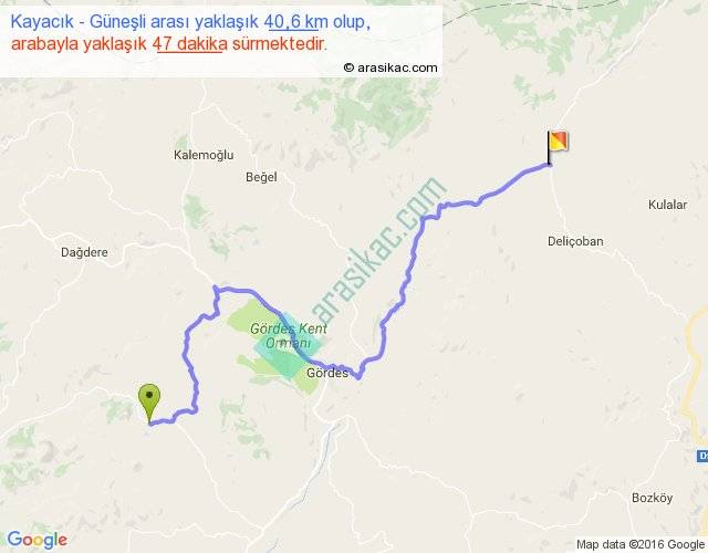 Kayacık - Güneşli arası yaklaşık olarak 90 km/h ile yukarıda belirtilen sürede olup, iki yerin kuş uçuşu uzaklığı (mesafesi) 25'dir. Yolculuk otobüsle 1 saat 1 dakika sürmektedir.