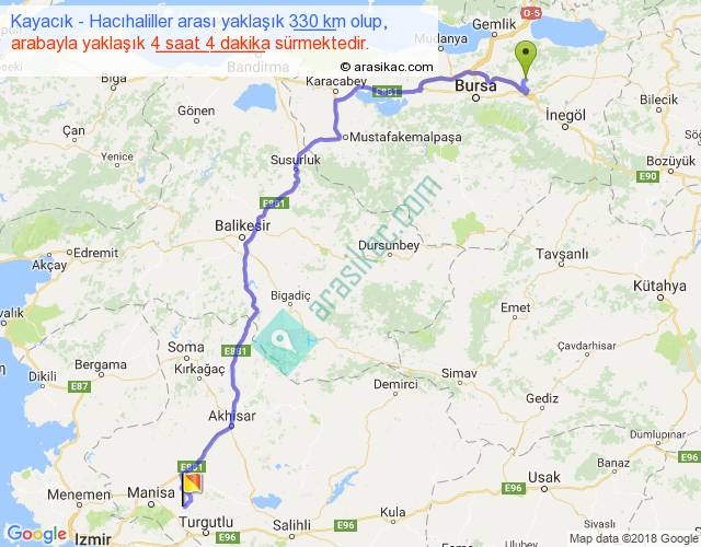 Kayacık - Hacıhaliller arası yaklaşık olarak 90 km/h ile yukarıda belirtilen sürede olup, iki yerin kuş uçuşu uzaklığı (mesafesi) 234'dir. Yolculuk otobüsle 5 saat 17 dakika sürmektedir.