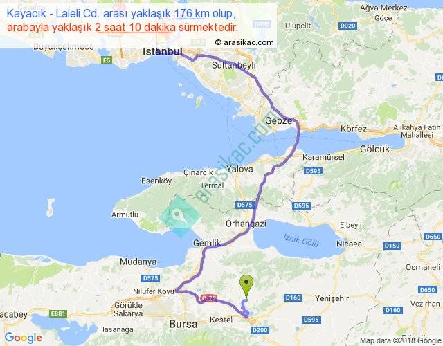 Kayacık - Laleli Cd. arası yaklaşık olarak 90 km/h ile yukarıda belirtilen sürede olup, iki yerin kuş uçuşu uzaklığı (mesafesi) 88'dir. Yolculuk otobüsle 2 saat 49 dakika sürmektedir.