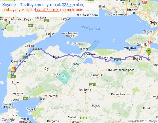 Kayacık - Tevfikiye arası yaklaşık olarak 90 km/h ile yukarıda belirtilen sürede olup, iki yerin kuş uçuşu uzaklığı (mesafesi) 261'dir. Eğer belirtilen yerler arasında uçak seferi var ise bu süre uçakla 24 dakika'ya kadar düşebilir. Yolculuk otobüsle 5 saat 21 dakika sürmektedir.