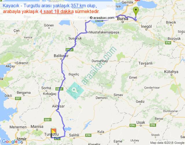 Kayacık - Turgutlu arası yaklaşık olarak 90 km/h ile yukarıda belirtilen sürede olup, iki yerin kuş uçuşu uzaklığı (mesafesi) 238'dir. Yolculuk otobüsle 5 saat 35 dakika sürmektedir.