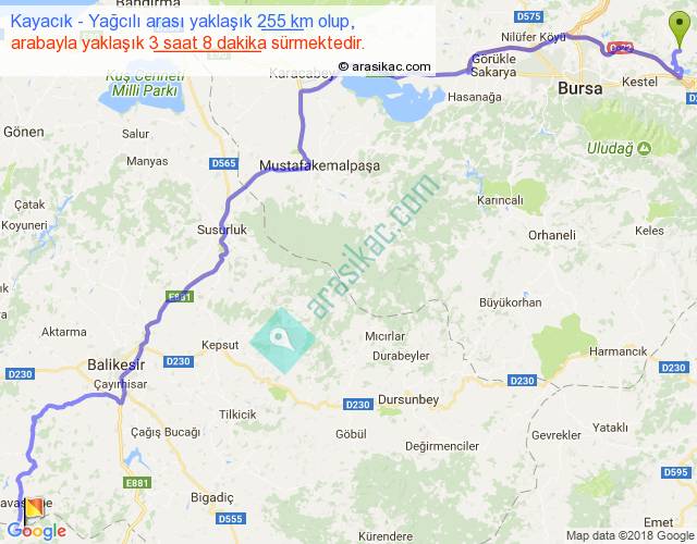 Kayacık - Yağcılı arası yaklaşık olarak 90 km/h ile yukarıda belirtilen sürede olup, iki yerin kuş uçuşu uzaklığı (mesafesi) 174'dir. Yolculuk otobüsle 4 saat 4 dakika sürmektedir.