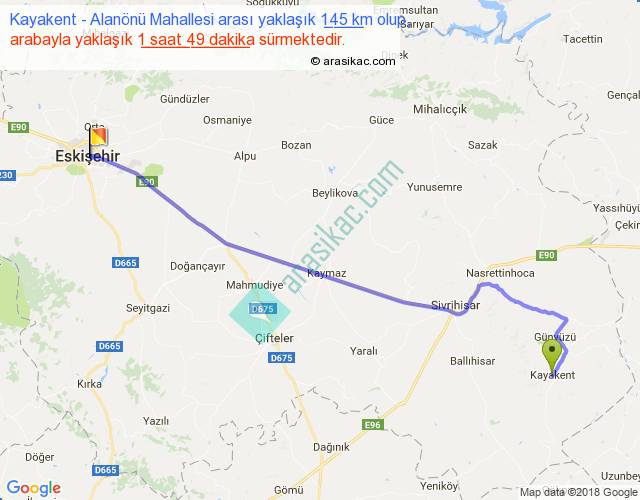 Kayakent - Alanönü Mahallesi arası yaklaşık olarak 90 km/h ile yukarıda belirtilen sürede olup, iki yerin kuş uçuşu uzaklığı (mesafesi) 119'dir. Yolculuk otobüsle 2 saat 21 dakika sürmektedir.