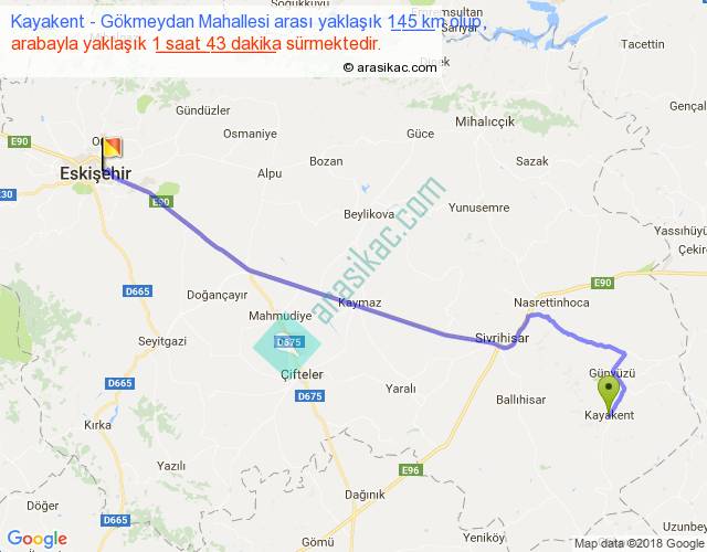 Kayakent - Gökmeydan Mahallesi arası yaklaşık olarak 90 km/h ile yukarıda belirtilen sürede olup, iki yerin kuş uçuşu uzaklığı (mesafesi) 119'dir. Yolculuk otobüsle 2 saat 13 dakika sürmektedir.