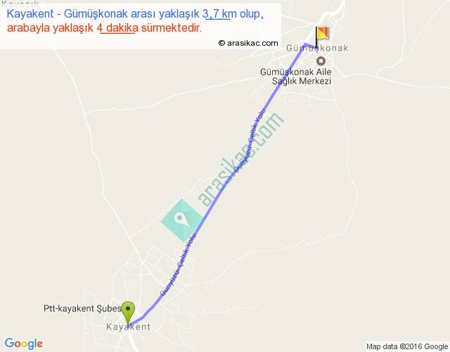 Kayakent - Gümüşkonak arası yaklaşık olarak 90 km/h ile yukarıda belirtilen sürede olup, iki yerin kuş uçuşu uzaklığı (mesafesi) 4'dir. Yolculuk otobüsle 5 dakika sürmektedir.