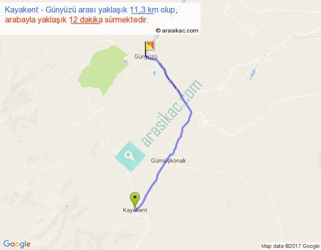 Kayakent - Günyüzü arası yaklaşık olarak 90 km/h ile yukarıda belirtilen sürede olup, iki yerin kuş uçuşu uzaklığı (mesafesi) 9'dir. Yolculuk otobüsle 15 dakika sürmektedir.