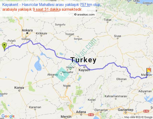 Kayakent - Hasırcılar Mahallesi arası yaklaşık olarak 90 km/h ile yukarıda belirtilen sürede olup, iki yerin kuş uçuşu uzaklığı (mesafesi) 573'dir. Eğer belirtilen yerler arasında uçak seferi var ise bu süre uçakla 52 dakika'ya kadar düşebilir. Yolculuk otobüsle 12 saat 22 dakika sürmektedir.