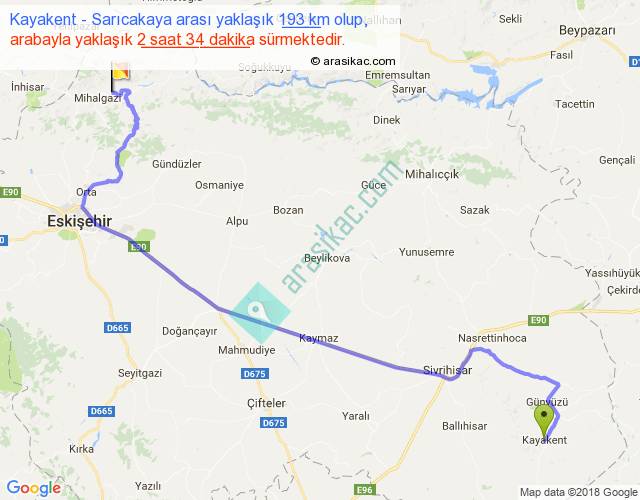 Kayakent - Sarıcakaya arası yaklaşık olarak 90 km/h ile yukarıda belirtilen sürede olup, iki yerin kuş uçuşu uzaklığı (mesafesi) 129'dir. Yolculuk otobüsle 3 saat 20 dakika sürmektedir.