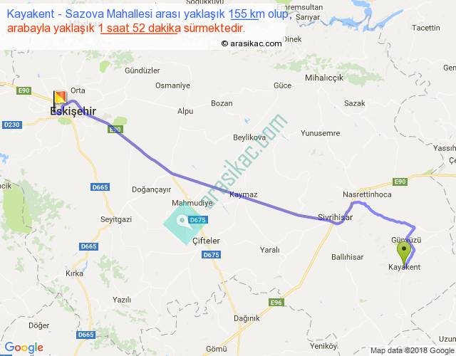 Kayakent - Sazova Mahallesi arası yaklaşık olarak 90 km/h ile yukarıda belirtilen sürede olup, iki yerin kuş uçuşu uzaklığı (mesafesi) 126'dir. Yolculuk otobüsle 2 saat 25 dakika sürmektedir.