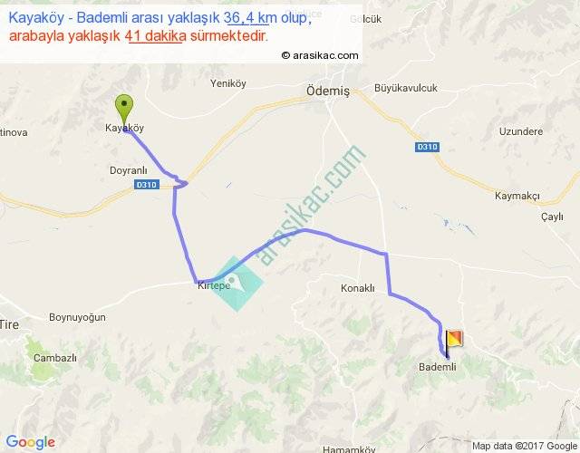 Kayaköy - Bademli arası yaklaşık olarak 90 km/h ile yukarıda belirtilen sürede olup, iki yerin kuş uçuşu uzaklığı (mesafesi) 26'dir. Yolculuk otobüsle 53 dakika sürmektedir.