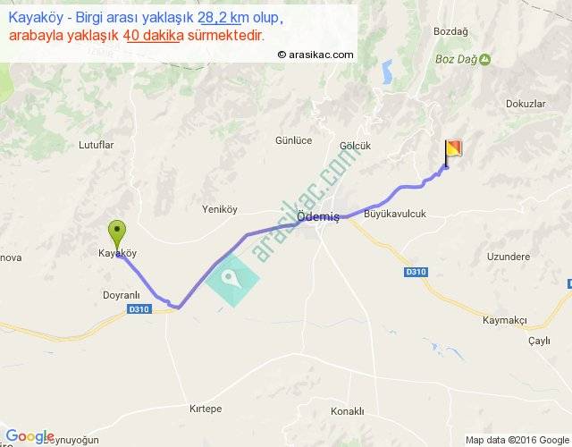 Kayaköy - Birgi arası yaklaşık olarak 90 km/h ile yukarıda belirtilen sürede olup, iki yerin kuş uçuşu uzaklığı (mesafesi) 23'dir. Yolculuk otobüsle 52 dakika sürmektedir.