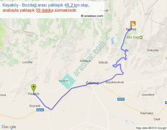 Kayaköy - Bozdağ arası yaklaşık olarak 90 km/h ile yukarıda belirtilen sürede olup, iki yerin kuş uçuşu uzaklığı (mesafesi) 27'dir. Yolculuk otobüsle 1 saat 16 dakika sürmektedir.