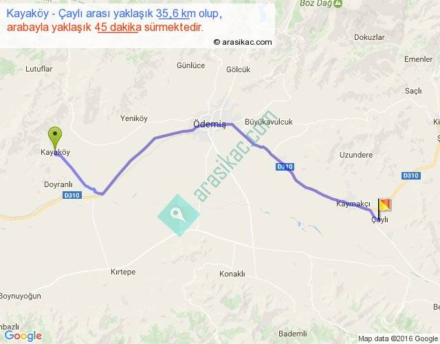 Kayaköy - Çaylı arası yaklaşık olarak 90 km/h ile yukarıda belirtilen sürede olup, iki yerin kuş uçuşu uzaklığı (mesafesi) 29'dir. Yolculuk otobüsle 58 dakika sürmektedir.