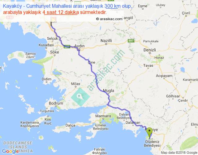 Kayaköy - Cumhuriyet Mahallesi arası yaklaşık olarak 90 km/h ile yukarıda belirtilen sürede olup, iki yerin kuş uçuşu uzaklığı (mesafesi) 232'dir. Yolculuk otobüsle 5 saat 27 dakika sürmektedir.