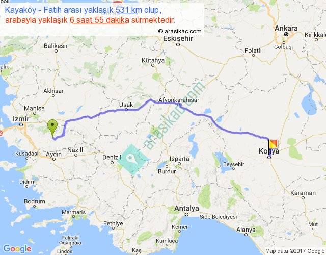 Kayaköy - Fatih arası yaklaşık olarak 90 km/h ile yukarıda belirtilen sürede olup, iki yerin kuş uçuşu uzaklığı (mesafesi) 408'dir. Eğer belirtilen yerler arasında uçak seferi var ise bu süre uçakla 37 dakika'ya kadar düşebilir. Yolculuk otobüsle 8 saat 59 dakika sürmektedir.