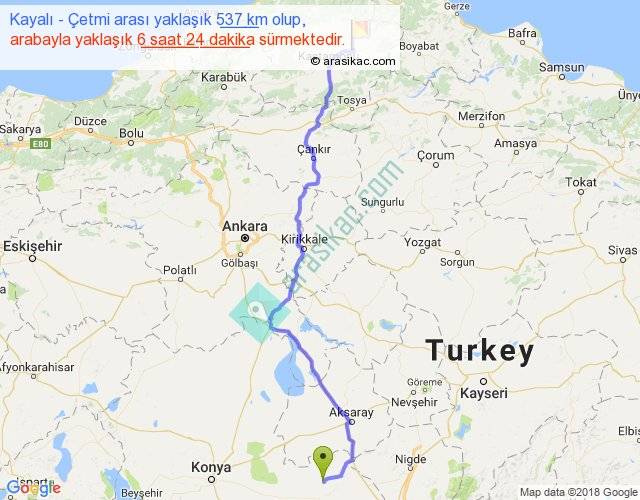 Kayalı - Çetmi arası yaklaşık olarak 90 km/h ile yukarıda belirtilen sürede olup, iki yerin kuş uçuşu uzaklığı (mesafesi) 404'dir. Eğer belirtilen yerler arasında uçak seferi var ise bu süre uçakla 37 dakika'ya kadar düşebilir. Yolculuk otobüsle 8 saat 19 dakika sürmektedir.