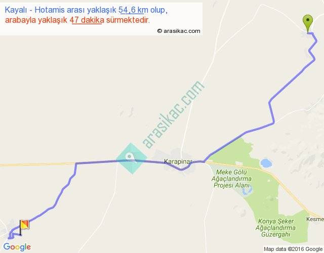 Kayalı - Hotamis arası yaklaşık olarak 90 km/h ile yukarıda belirtilen sürede olup, iki yerin kuş uçuşu uzaklığı (mesafesi) 42'dir. Yolculuk otobüsle 1 saat 1 dakika sürmektedir.