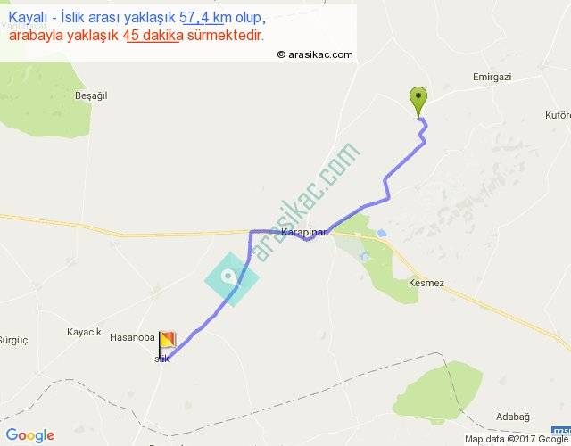 Kayalı - İslik arası yaklaşık olarak 90 km/h ile yukarıda belirtilen sürede olup, iki yerin kuş uçuşu uzaklığı (mesafesi) 47'dir. Yolculuk otobüsle 58 dakika sürmektedir.