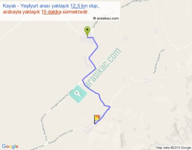 Kayalı - Yeşilyurt arası yaklaşık olarak 90 km/h ile yukarıda belirtilen sürede olup, iki yerin kuş uçuşu uzaklığı (mesafesi) 9'dir. Yolculuk otobüsle 19 dakika sürmektedir.