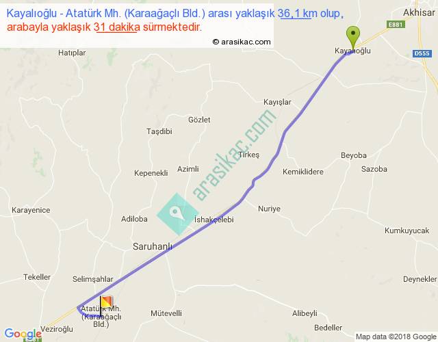 Kayalıoğlu - Atatürk Mh. (Karaağaçlı Bld.) arası yaklaşık olarak 90 km/h ile yukarıda belirtilen sürede olup, iki yerin kuş uçuşu uzaklığı (mesafesi) 32'dir. Yolculuk otobüsle 40 dakika sürmektedir.