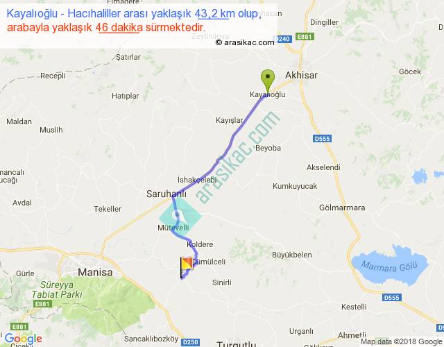 Kayalıoğlu - Hacıhaliller arası yaklaşık olarak 90 km/h ile yukarıda belirtilen sürede olup, iki yerin kuş uçuşu uzaklığı (mesafesi) 35'dir. Yolculuk otobüsle 59 dakika sürmektedir.