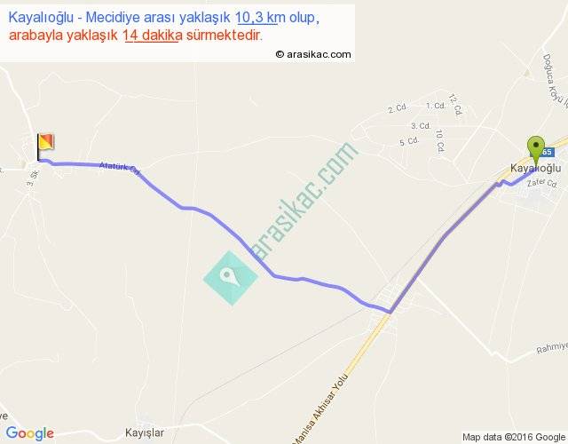 Kayalıoğlu - Mecidiye arası yaklaşık olarak 90 km/h ile yukarıda belirtilen sürede olup, iki yerin kuş uçuşu uzaklığı (mesafesi) 8'dir. Yolculuk otobüsle 18 dakika sürmektedir.