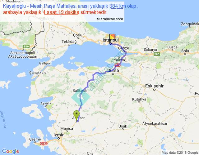 Kayalıoğlu - Mesih Paşa Mahallesi arası yaklaşık olarak 90 km/h ile yukarıda belirtilen sürede olup, iki yerin kuş uçuşu uzaklığı (mesafesi) 255'dir. Eğer belirtilen yerler arasında uçak seferi var ise bu süre uçakla 23 dakika'ya kadar düşebilir. Yolculuk otobüsle 5 saat 36 dakika sürmektedir.
