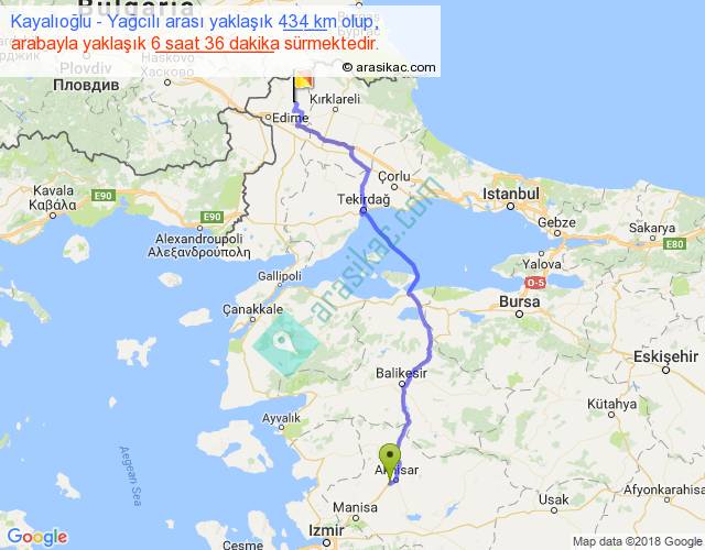 Kayalıoğlu - Yağcılı arası yaklaşık olarak 90 km/h ile yukarıda belirtilen sürede olup, iki yerin kuş uçuşu uzaklığı (mesafesi) 330'dir. Eğer belirtilen yerler arasında uçak seferi var ise bu süre uçakla 30 dakika'ya kadar düşebilir. Yolculuk otobüsle 8 saat 34 dakika sürmektedir.
