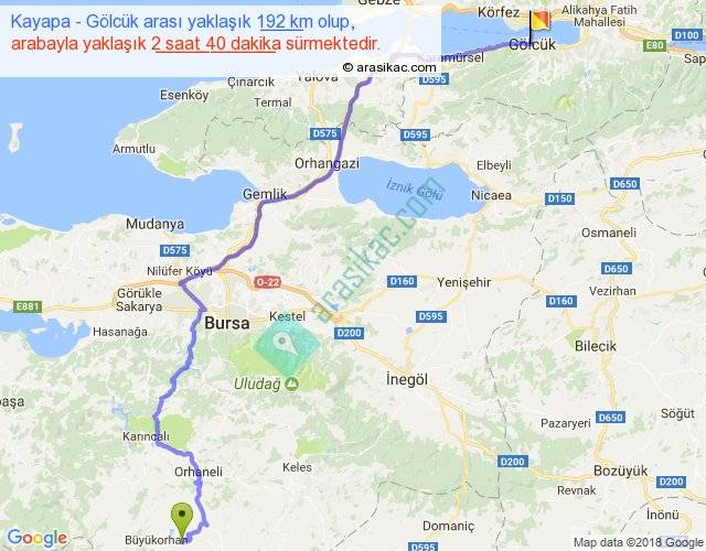 Kayapa - Gölcük arası yaklaşık olarak 90 km/h ile yukarıda belirtilen sürede olup, iki yerin kuş uçuşu uzaklığı (mesafesi) 128'dir. Yolculuk otobüsle 3 saat 28 dakika sürmektedir.