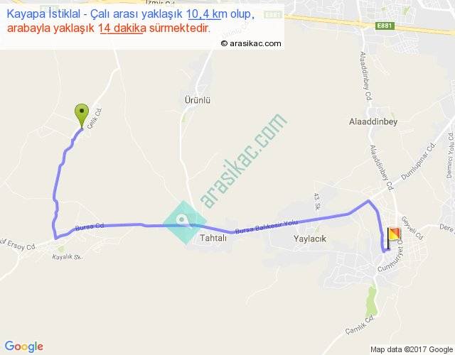 Kayapa İstiklal - Çalı arası yaklaşık olarak 90 km/h ile yukarıda belirtilen sürede olup, iki yerin kuş uçuşu uzaklığı (mesafesi) 7'dir. Yolculuk otobüsle 18 dakika sürmektedir.
