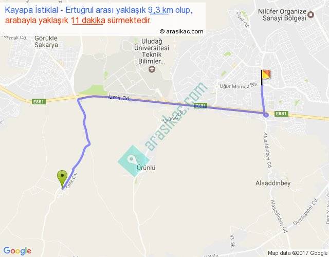 Kayapa İstiklal - Ertuğrul arası yaklaşık olarak 90 km/h ile yukarıda belirtilen sürede olup, iki yerin kuş uçuşu uzaklığı (mesafesi) 6'dir. Yolculuk otobüsle 14 dakika sürmektedir.
