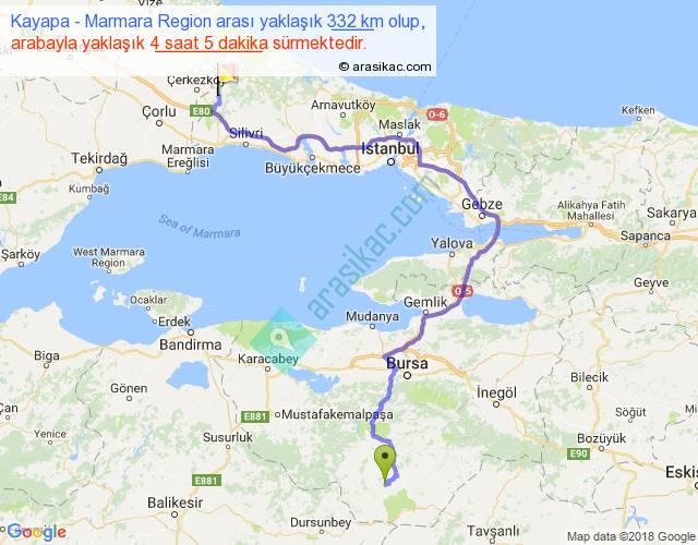 Kayapa - Marmara Region arası yaklaşık olarak 90 km/h ile yukarıda belirtilen sürede olup, iki yerin kuş uçuşu uzaklığı (mesafesi) 179'dir. Yolculuk otobüsle 5 saat 18 dakika sürmektedir.