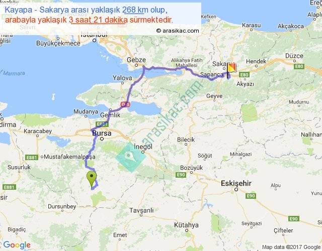 Kayapa - Sakarya arası yaklaşık olarak 90 km/h ile yukarıda belirtilen sürede olup, iki yerin kuş uçuşu uzaklığı (mesafesi) 162'dir. Yolculuk otobüsle 4 saat 21 dakika sürmektedir.