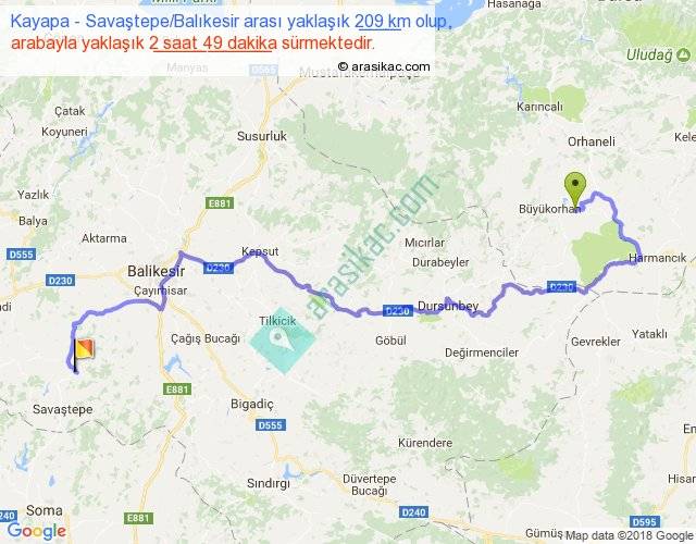 Kayapa - Savaştepe Balıkesir arası yaklaşık olarak 90 km/h ile yukarıda belirtilen sürede olup, iki yerin kuş uçuşu uzaklığı (mesafesi) 113'dir. Yolculuk otobüsle 3 saat 39 dakika sürmektedir.