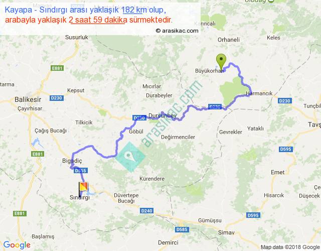 Kayapa - Sındırgı arası yaklaşık olarak 90 km/h ile yukarıda belirtilen sürede olup, iki yerin kuş uçuşu uzaklığı (mesafesi) 88'dir. Yolculuk otobüsle 3 saat 52 dakika sürmektedir.