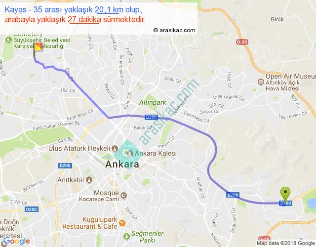 Kayas - 35 arası yaklaşık olarak 90 km/h ile yukarıda belirtilen sürede olup, iki yerin kuş uçuşu uzaklığı (mesafesi) 17'dir. Yolculuk otobüsle 35 dakika sürmektedir.