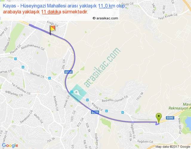 Kayas - Hüseyingazi Mahallesi arası yaklaşık olarak 90 km/h ile yukarıda belirtilen sürede olup, iki yerin kuş uçuşu uzaklığı (mesafesi) 7'dir. Yolculuk otobüsle 14 dakika sürmektedir.
