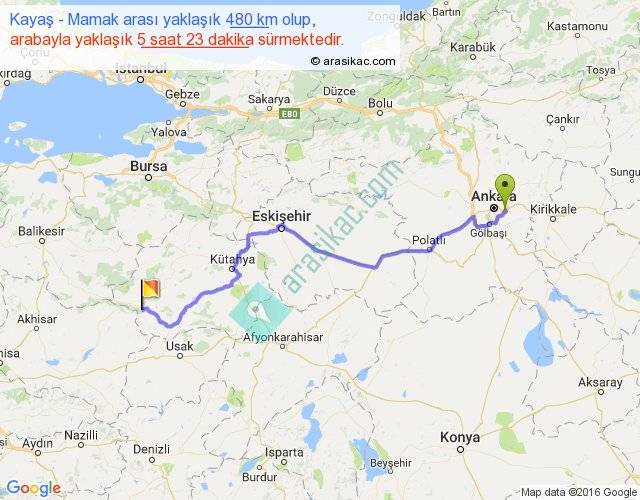 Kayaş - Mamak arası yaklaşık olarak 90 km/h ile yukarıda belirtilen sürede olup, iki yerin kuş uçuşu uzaklığı (mesafesi) 352'dir. Eğer belirtilen yerler arasında uçak seferi var ise bu süre uçakla 32 dakika'ya kadar düşebilir. Yolculuk otobüsle 6 saat 59 dakika sürmektedir.