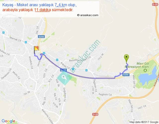 Kayaş - Misket arası yaklaşık olarak 90 km/h ile yukarıda belirtilen sürede olup, iki yerin kuş uçuşu uzaklığı (mesafesi) 5'dir. Yolculuk otobüsle 14 dakika sürmektedir.
