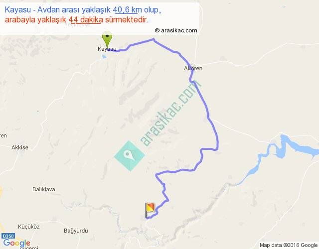 Kayasu - Avdan arası yaklaşık olarak 90 km/h ile yukarıda belirtilen sürede olup, iki yerin kuş uçuşu uzaklığı (mesafesi) 21'dir. Yolculuk otobüsle 57 dakika sürmektedir.