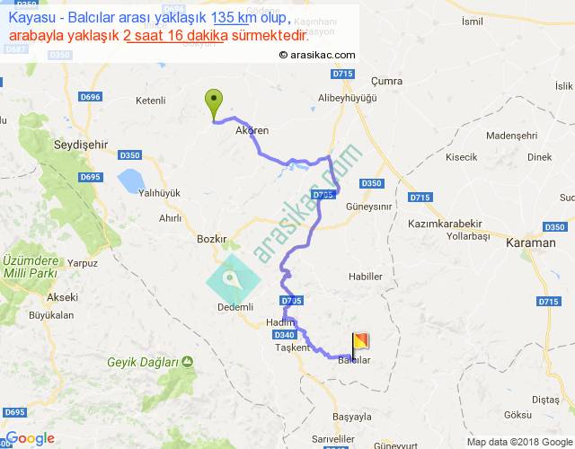 Kayasu - Balcılar arası yaklaşık olarak 90 km/h ile yukarıda belirtilen sürede olup, iki yerin kuş uçuşu uzaklığı (mesafesi) 75'dir. Yolculuk otobüsle 2 saat 56 dakika sürmektedir.