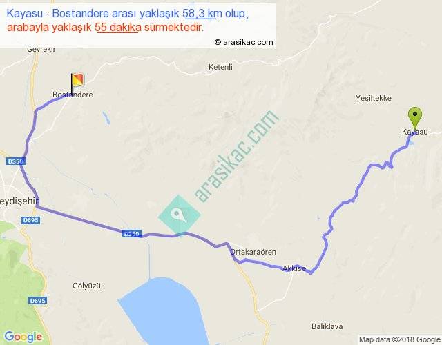 Kayasu - Bostandere arası yaklaşık olarak 90 km/h ile yukarıda belirtilen sürede olup, iki yerin kuş uçuşu uzaklığı (mesafesi) 30'dir. Yolculuk otobüsle 1 saat 11 dakika sürmektedir.