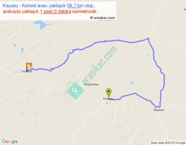 Kayasu - Ketenli arası yaklaşık olarak 90 km/h ile yukarıda belirtilen sürede olup, iki yerin kuş uçuşu uzaklığı (mesafesi) 18'dir. Yolculuk otobüsle 1 saat 18 dakika sürmektedir.