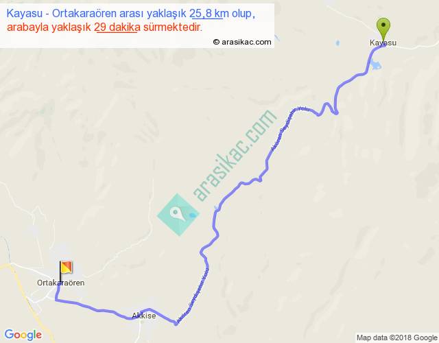 Kayasu - Ortakaraören arası yaklaşık olarak 90 km/h ile yukarıda belirtilen sürede olup, iki yerin kuş uçuşu uzaklığı (mesafesi) 18'dir. Yolculuk otobüsle 37 dakika sürmektedir.