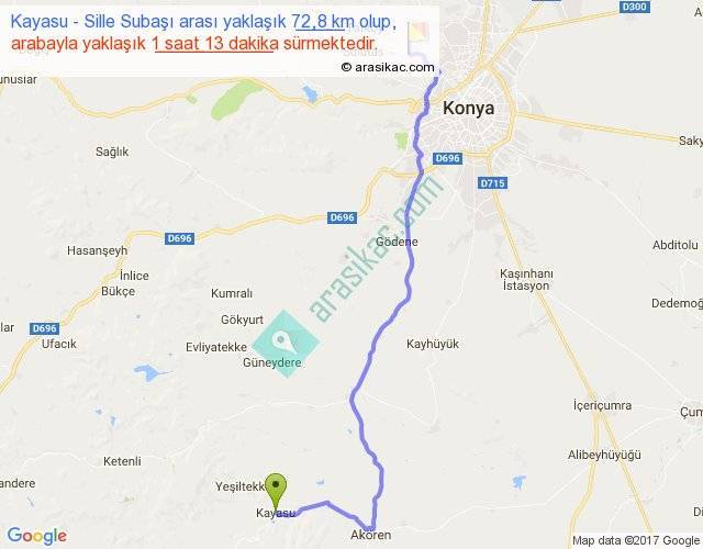 Kayasu - Sille Subaşı arası yaklaşık olarak 90 km/h ile yukarıda belirtilen sürede olup, iki yerin kuş uçuşu uzaklığı (mesafesi) 52'dir. Yolculuk otobüsle 1 saat 34 dakika sürmektedir.